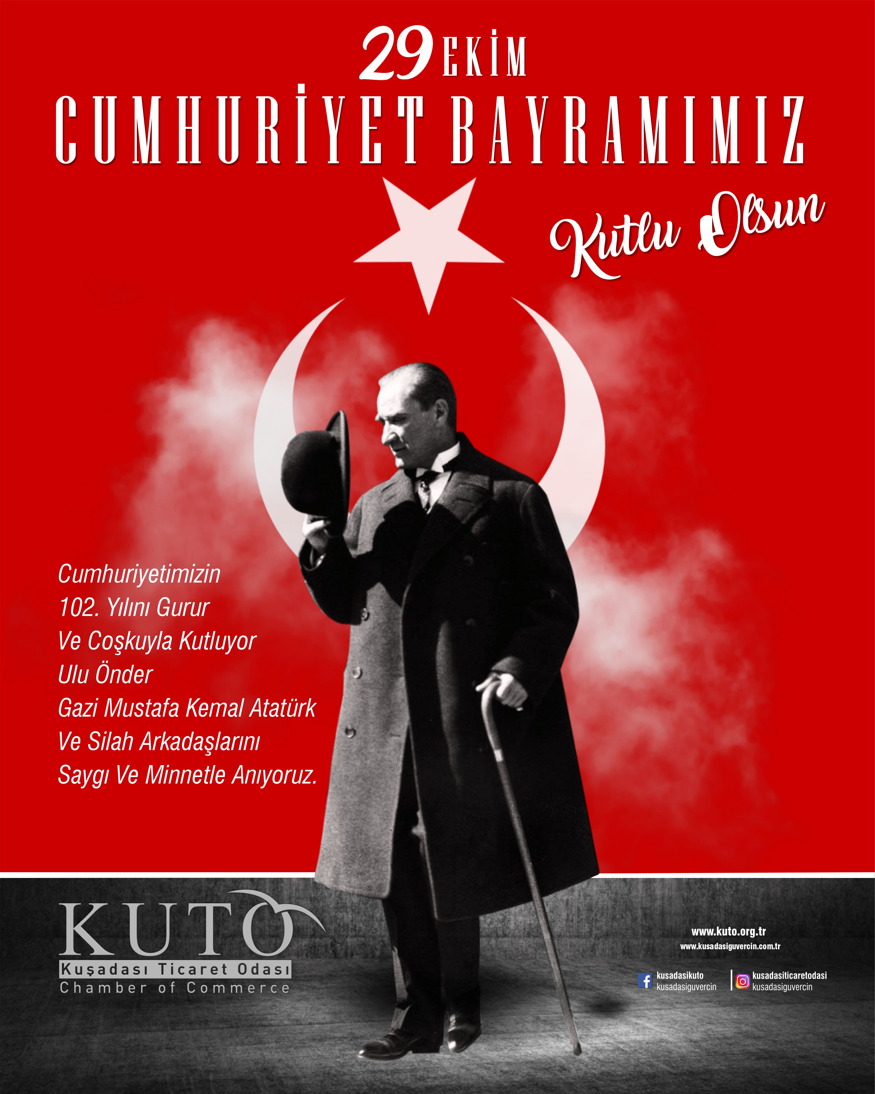 Cumhuriyetimizin 102. kuruluş yıl dönümünü gururla kutluyor, Ulu Önder Gazi Mustafa Kemal Atatürk ve silah arkadaşlarını saygı ve minnetle anıyoruz.29 Ekim Cumhuriyet Bayramımız Kutlu Olsun.